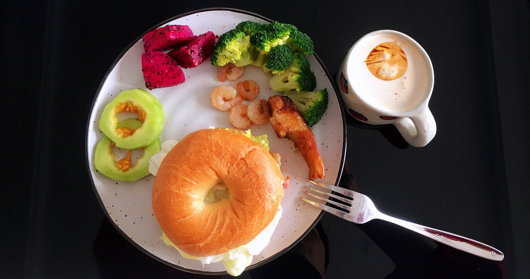 贝果培根三明治,水果,水煮西蓝花,煎虾仁,煎鲈鱼,拿铁。