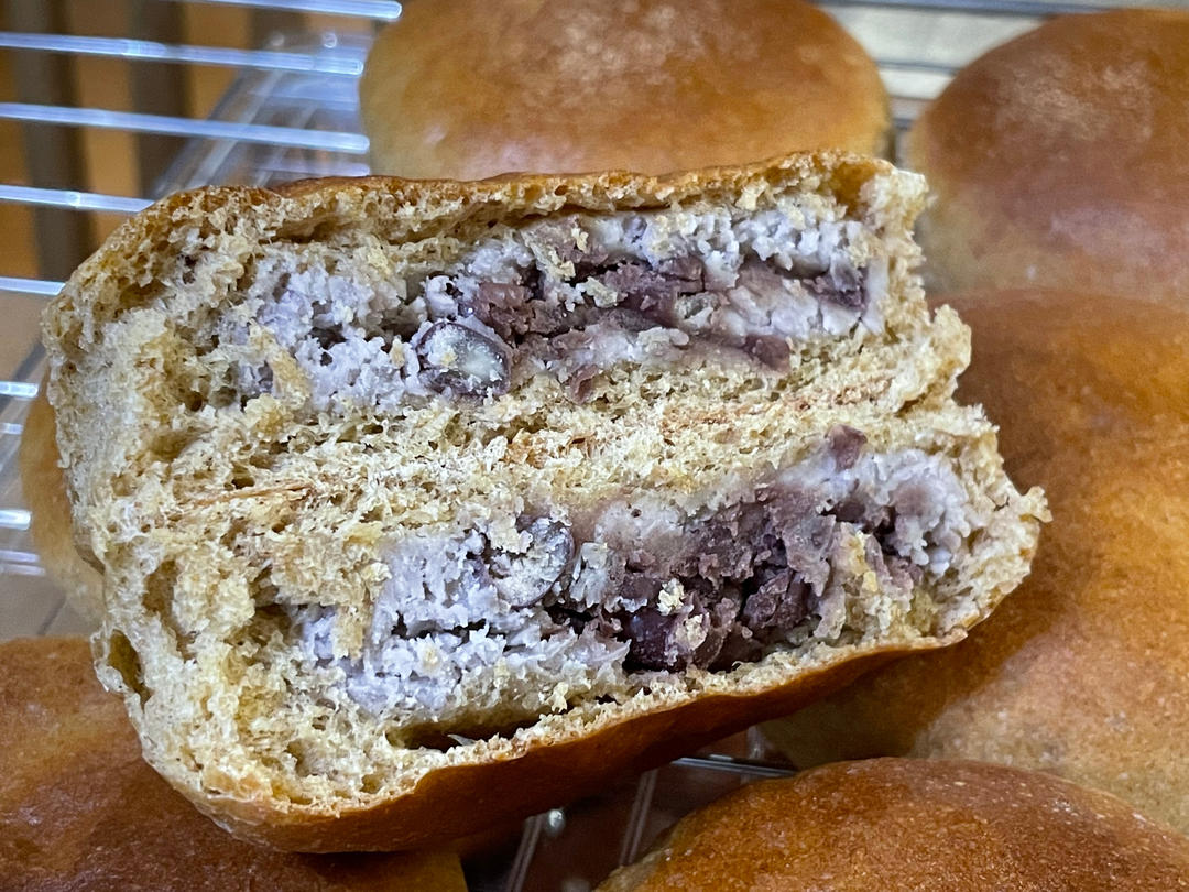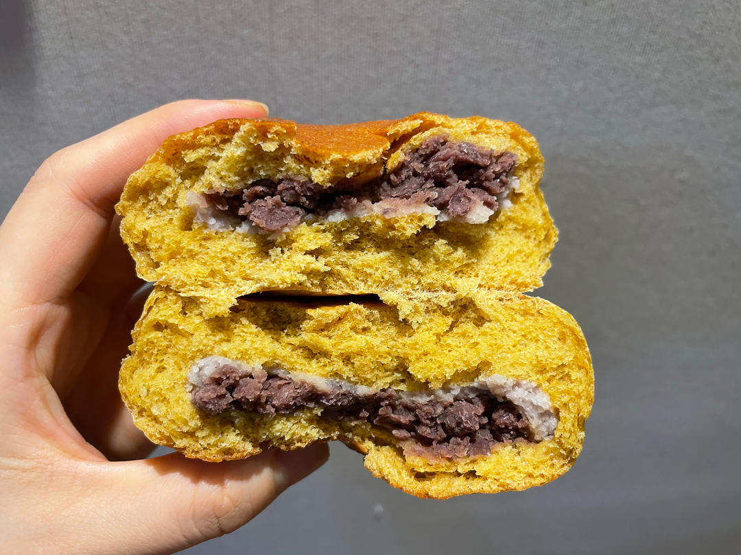 胡萝卜汁和面,红豆馅加了一点点芋泥(下次要大量芋泥)