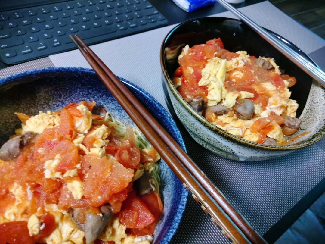西红柿鸡蛋拌面加了点酒香鸡心