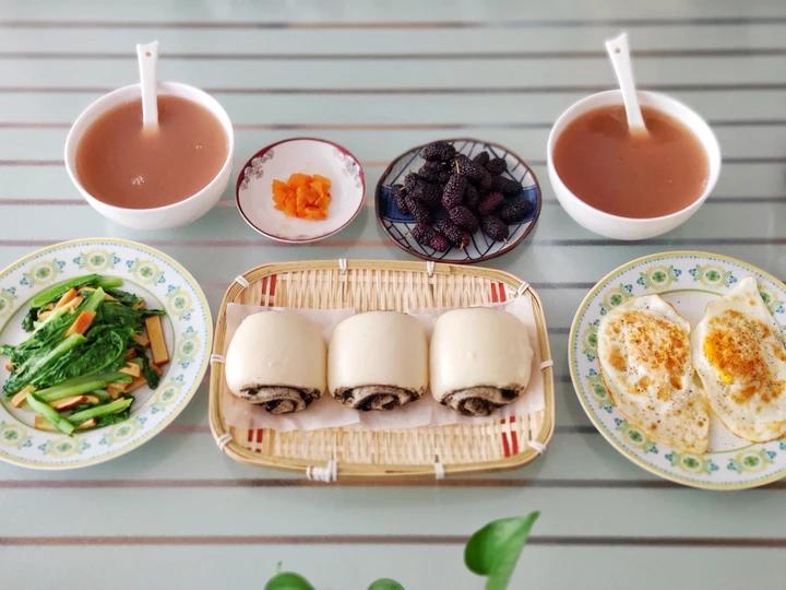 黑芝麻酱夹心馒头、绿豆麦仁粥、锦州小菜、小白菜炒香干、煎蛋、桑葚。