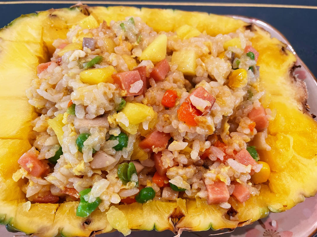菠萝炒饭!队友炒蛋习惯性放了水结果炒饭太湿了!哎!可惜我上好的菠萝呀!