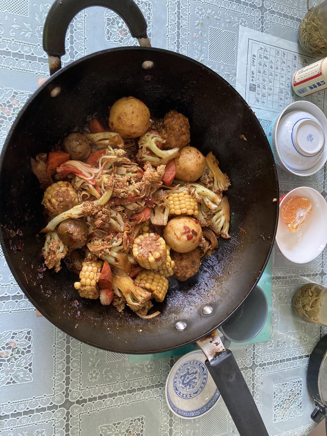 搜搜索索食材:各种丸子,冷冻玉米🌽,花菜,笋片,海底捞麻辣香锅调味料(好在最后一包之前忘记吃了...