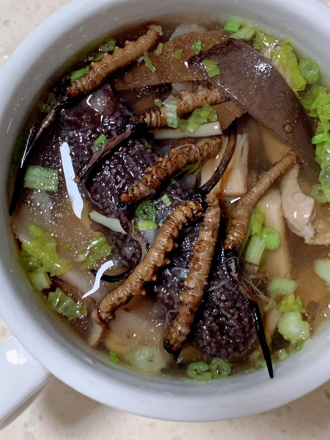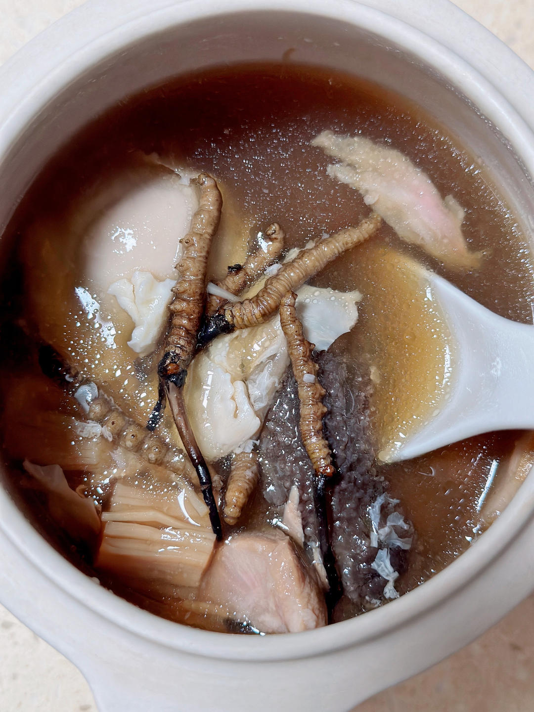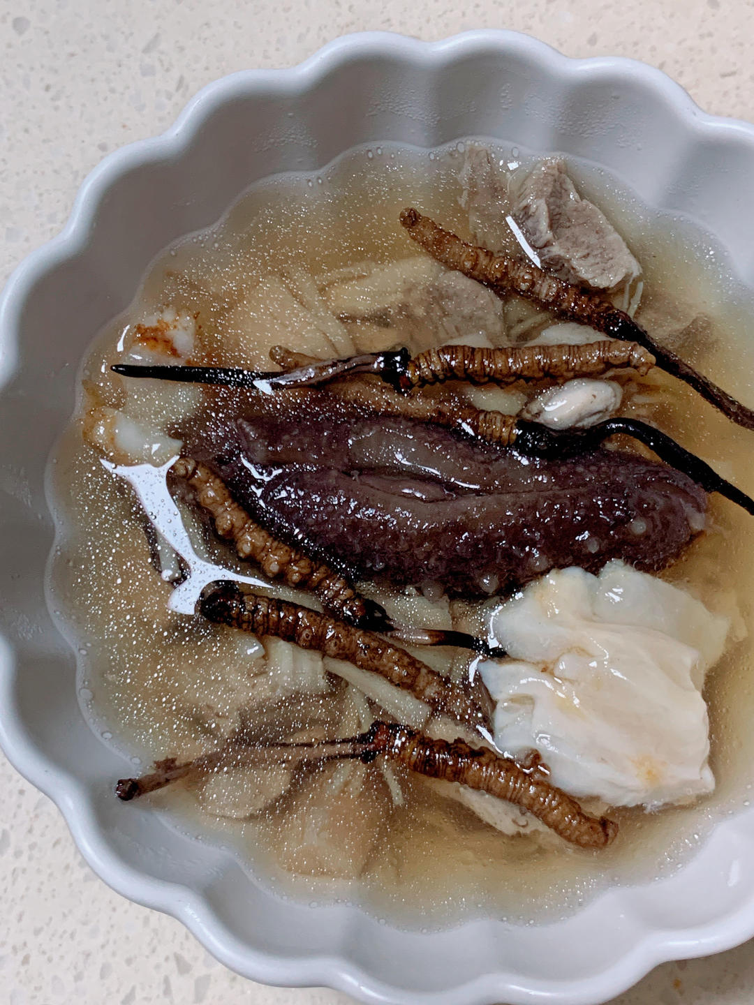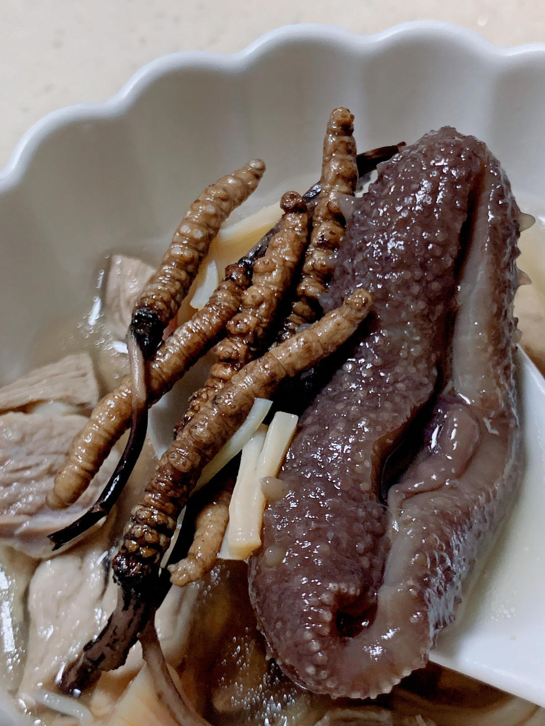 虫草海参鱼胶日本元贝腱子肉汤。