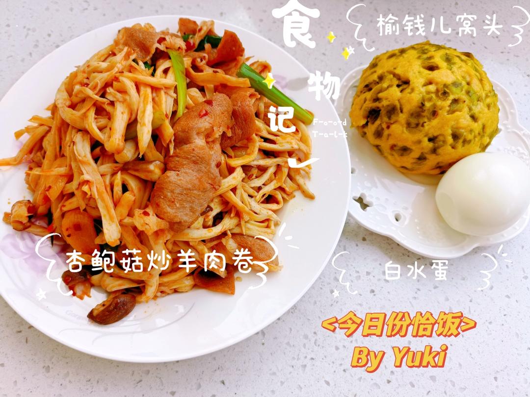 今日份午餐,杏鲍菇炒羊肉卷,榆钱儿窝头和白水鸡蛋。