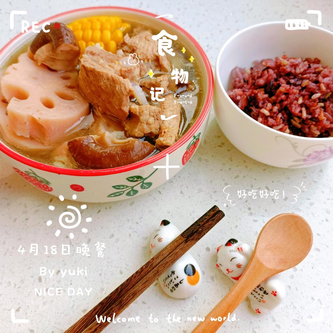 一碗莲藕排骨汤,一碗杂粮粉,简单有营养,热量也不高哦!