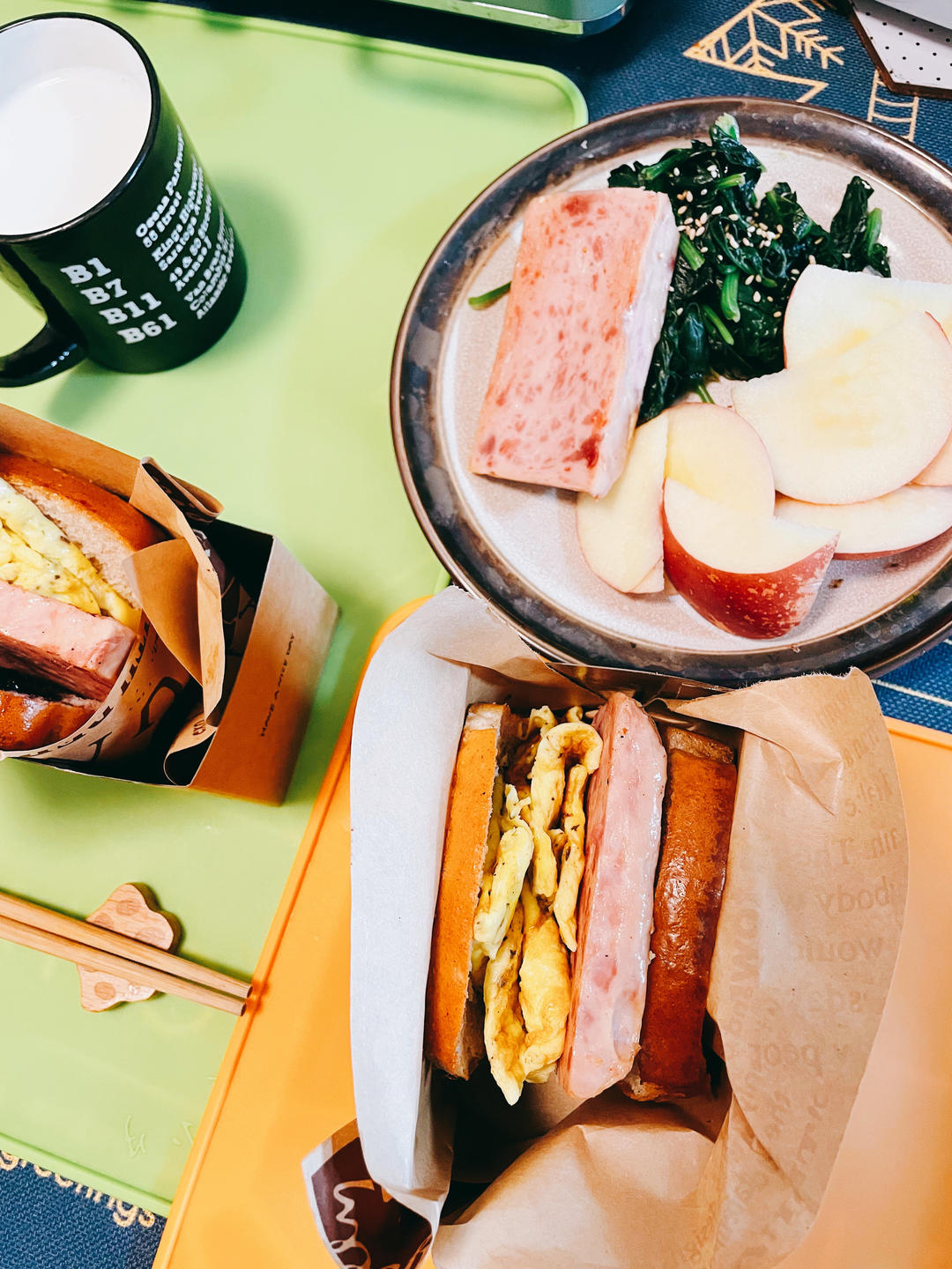 午餐肉厚蛋烧三明治,菠菜苹果