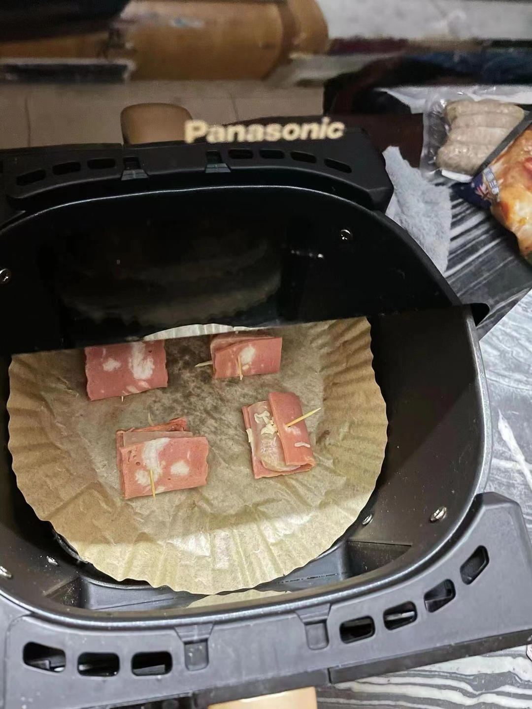 家常快手菜,宝宝爱吃鸡腿和芝士,我奇思妙想了一下,结合一下,先烤鸡腿,松下空气炸锅可视化方便观察...