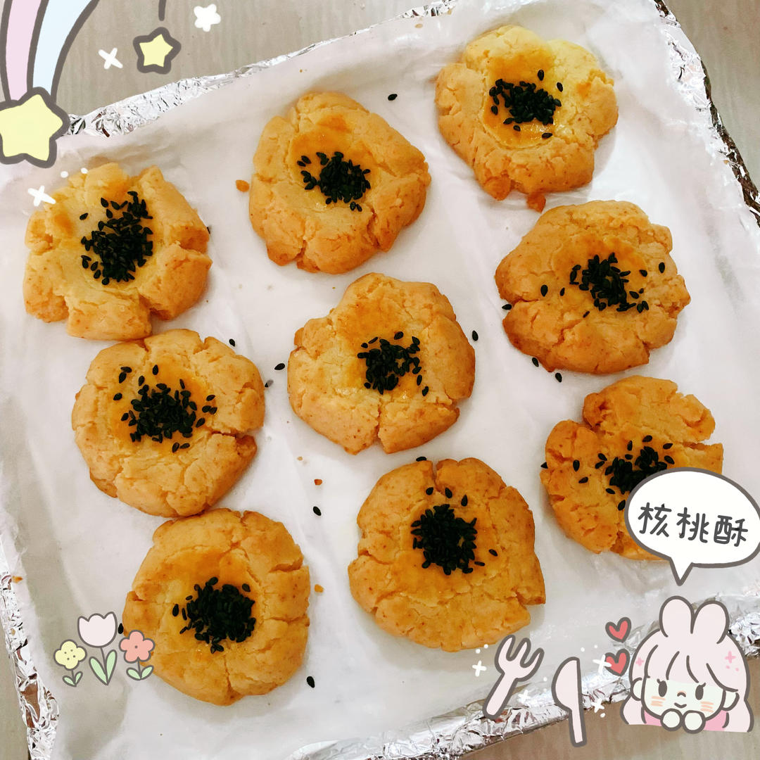 低粉130(没有了用面粉跟土豆淀粉4:1调配的),油65g,蛋黄20g,糖40g(感觉有点甜),泡打粉2g,盐1g,小烤...