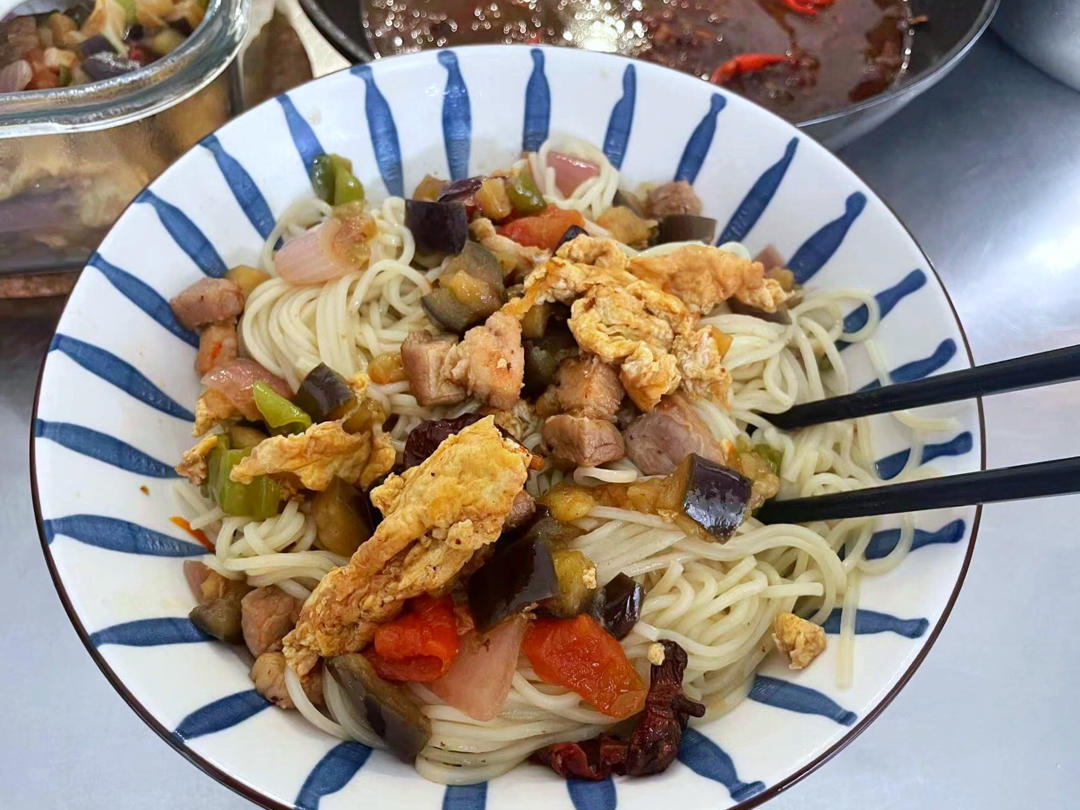 茄子肉丁西红柿鸡蛋拌面