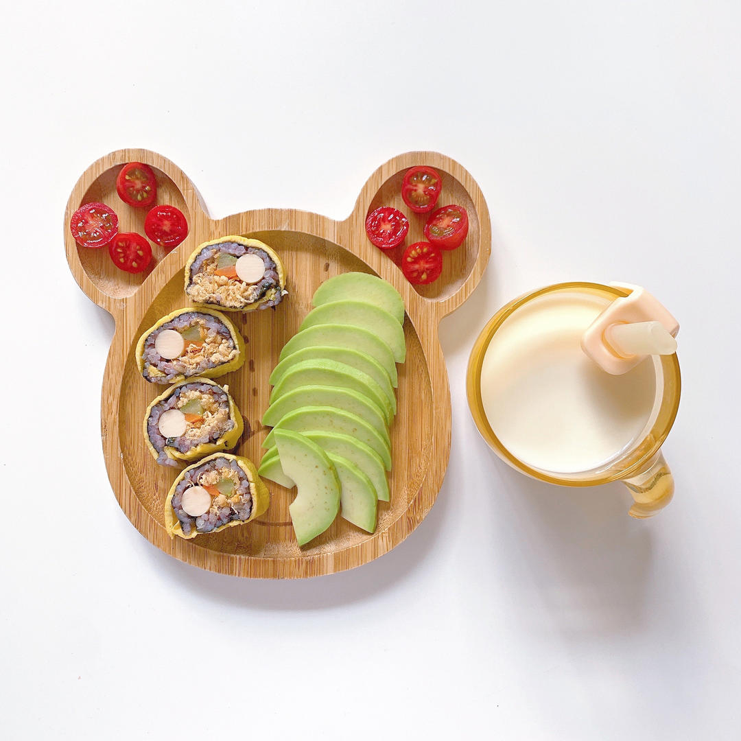 蛋皮鳕鱼肠寿司、牛油果、小番茄、牛奶