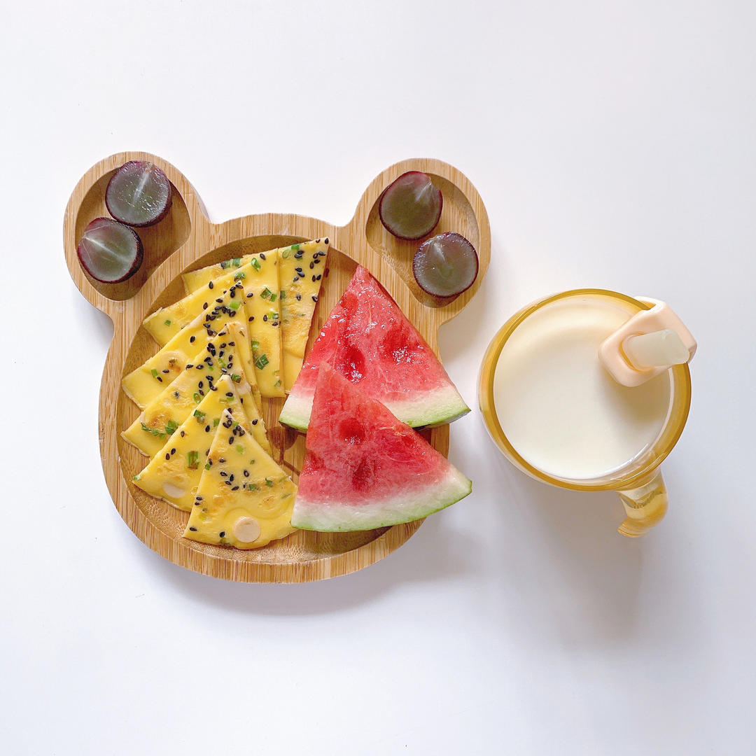 鳕鱼肠蛋饼、西瓜、葡萄、牛奶