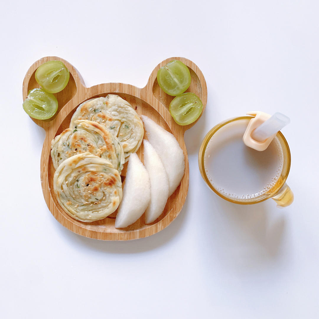 葱油饼、黑豆浆、梨、青提