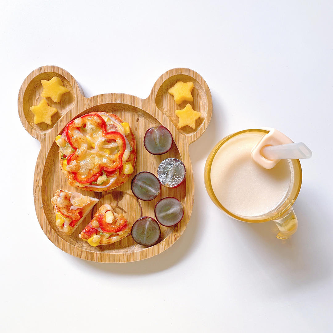 吐司披萨、葡萄、黄桃、牛奶