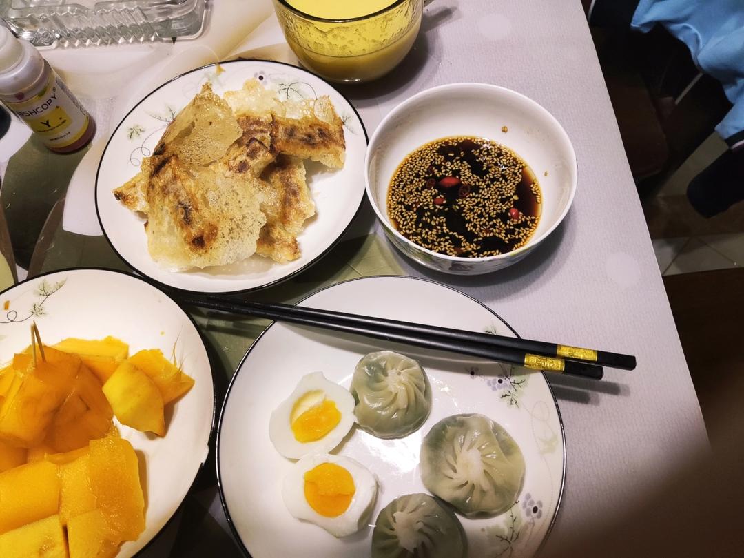 荠菜包子,煎饺,玉米汁,水果😊