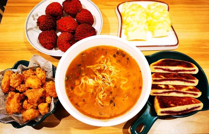 云南菌汤鸡丝米线,鸡米花,山药芋泥饼,荔枝王,小菠萝🍍