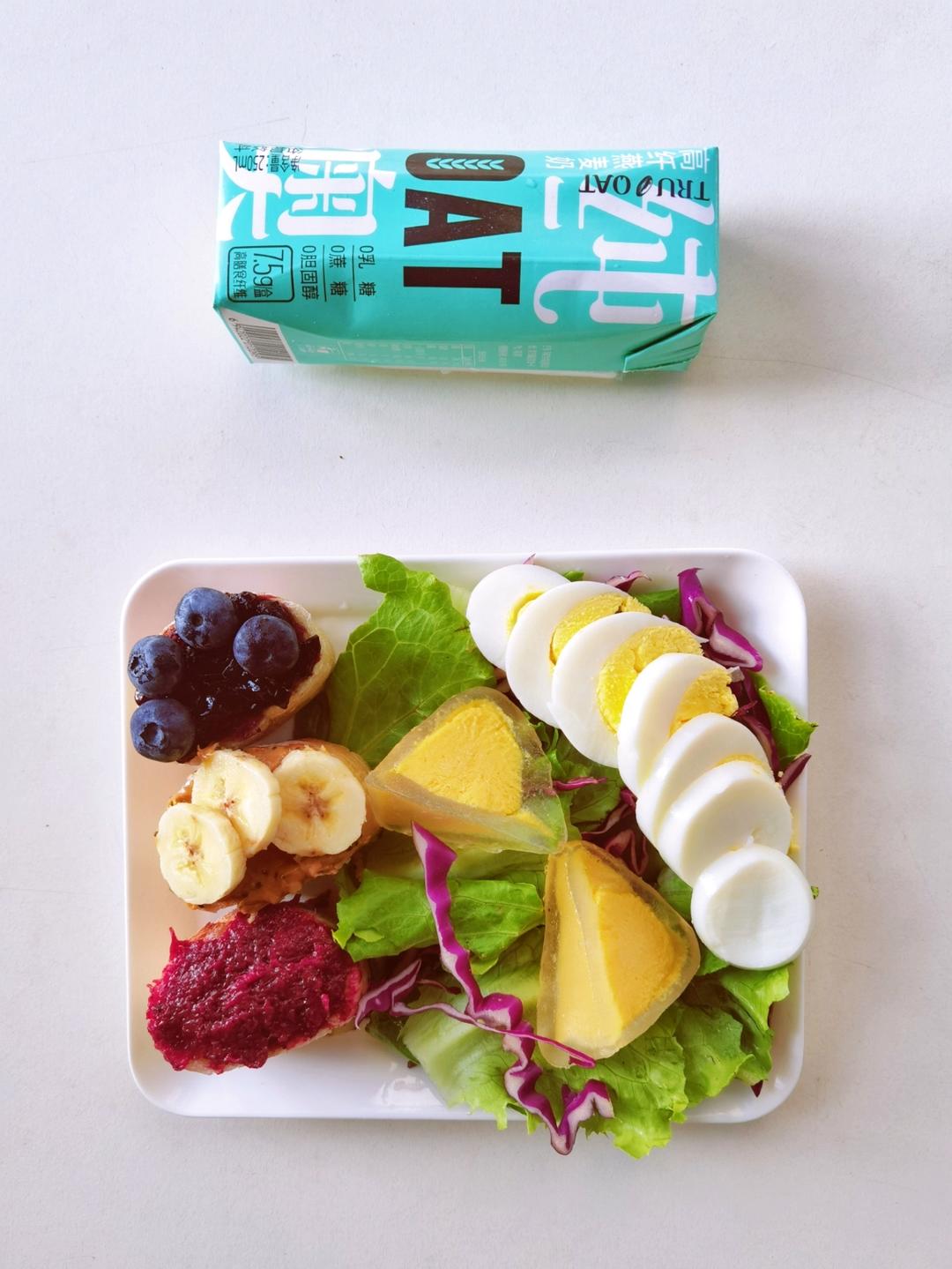 今日早餐分享:开放式三明治+水果沙拉+山药豆+牛奶+坚果