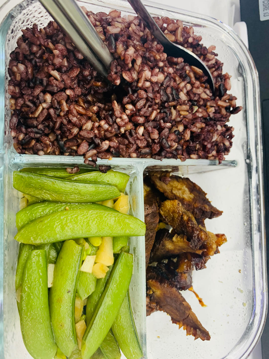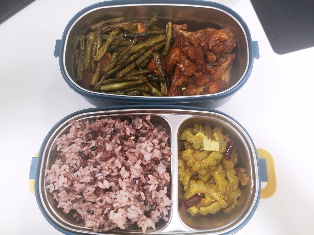 红烧鸡翅根、炒豆角、凉拌苦瓜,外加一份杂粮饭