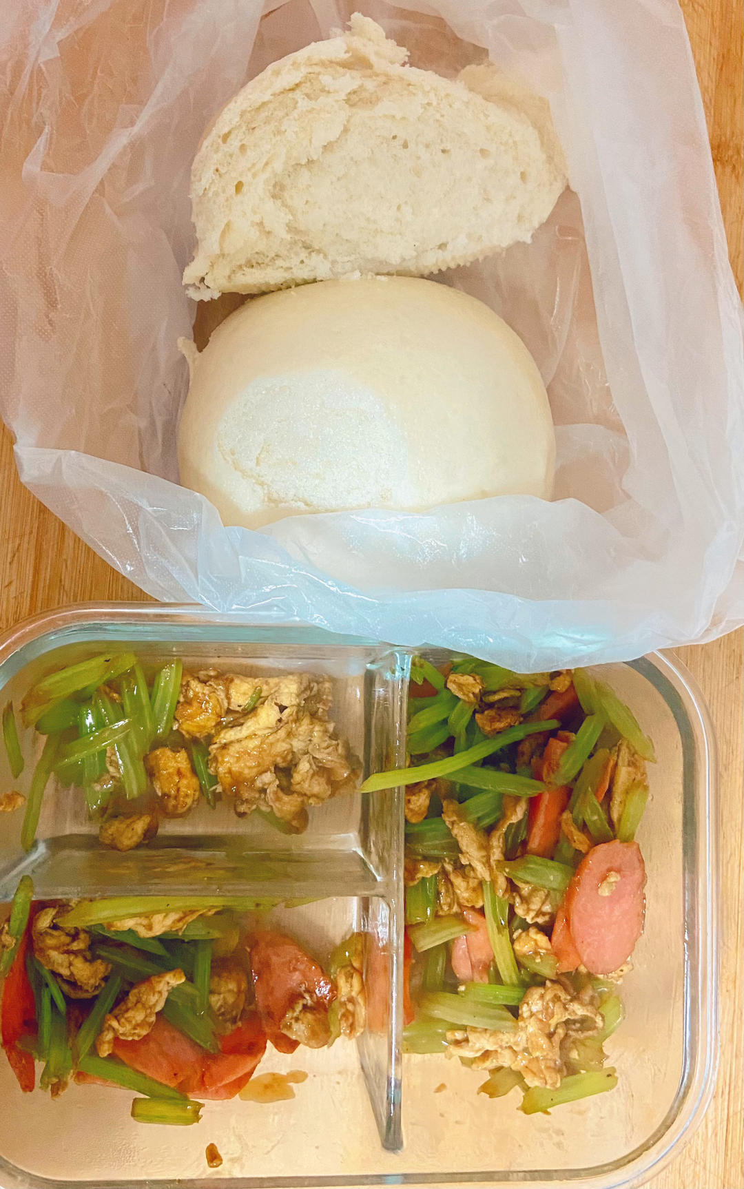 馒头 芹菜炒鸡蛋香肠