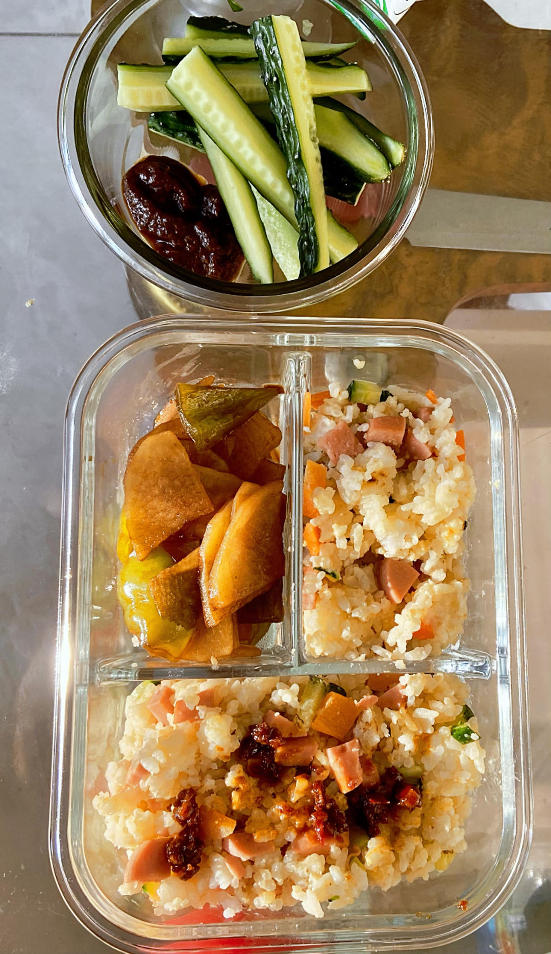 蛋炒饭(上面牛肉粒) 黄瓜蘸酱菜,一个🍅西红柿