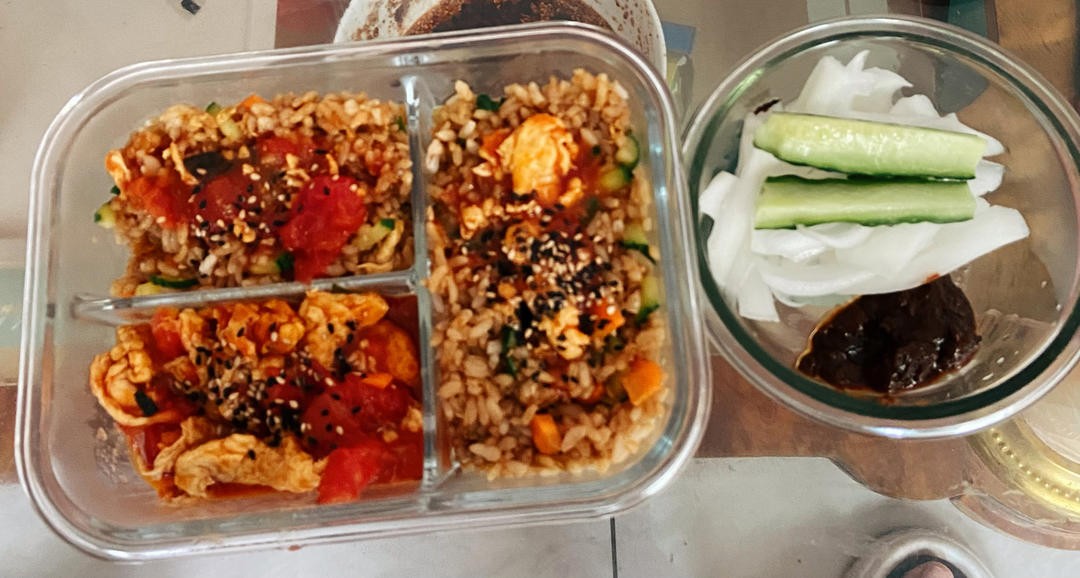 蛋炒饭 西红柿炒鸡蛋 黄瓜洋葱蘸酱