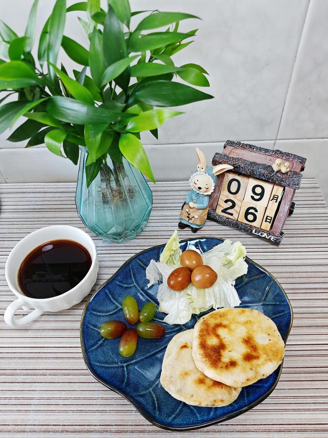 9.26早餐日记:发面馅饼+五香鹌鹑蛋+生菜+葡萄+黑咖啡