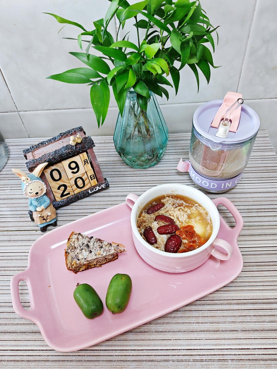 9.20早餐日记:香蕉燕麦蛋糕+红糖醪糟蒸蛋+奶咖+猕猴桃