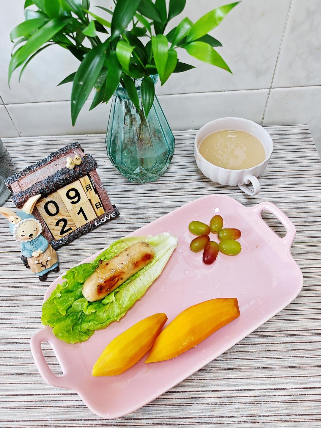 9.21早餐日记:蒸红薯+烤肠+生菜+去葡萄+生椰拿铁