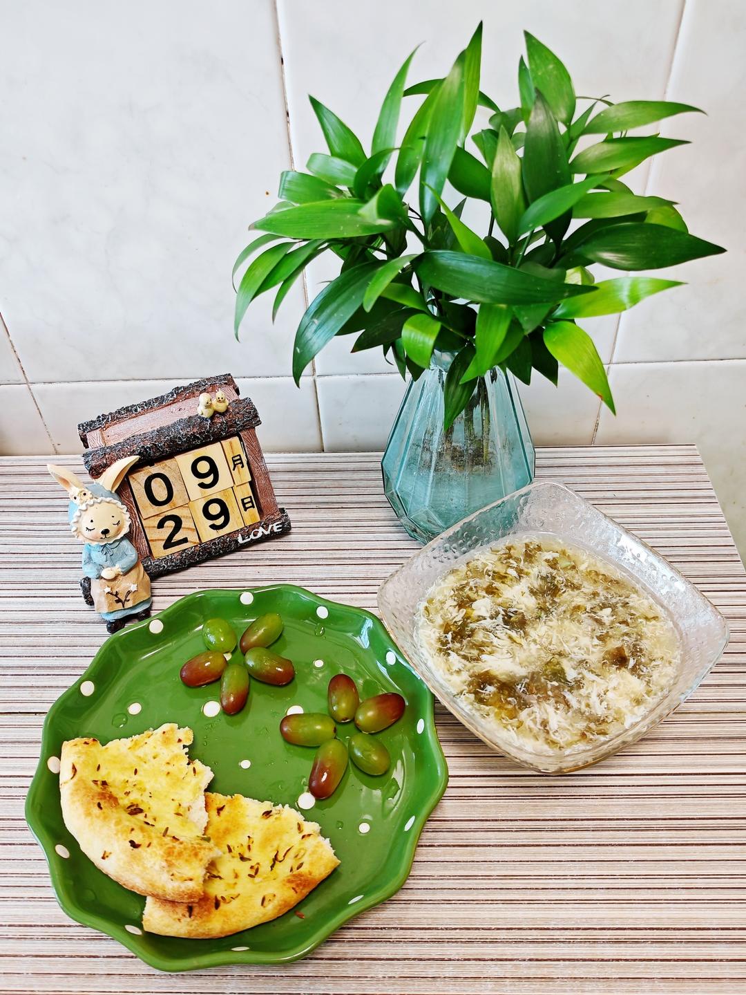 9.29早餐日记:新疆馕饼+紫菜蛋花汤+葡萄