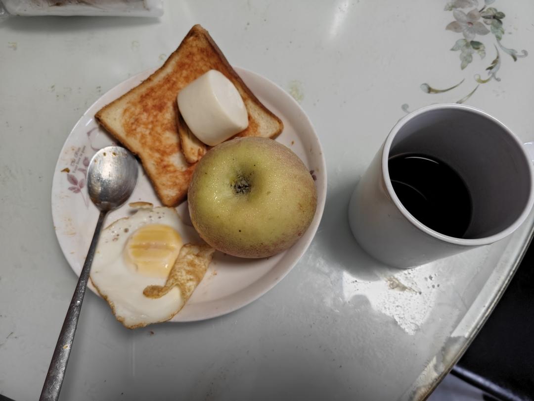 今天早餐8点吃的 咖啡,苹果,鸡蛋,面包
