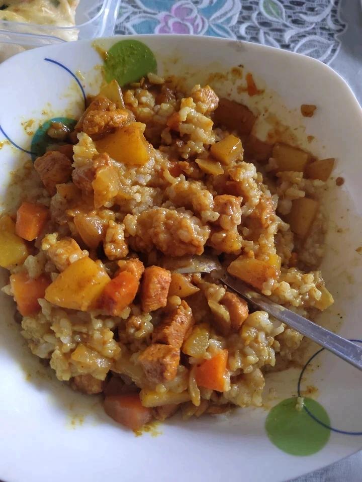 好吃。用了超市买的生榨椰子汁,没吃出来椰子味儿。因为米蒸的太湿了,所以就让咖喱收汁收的干了一些,其他的都挺好。