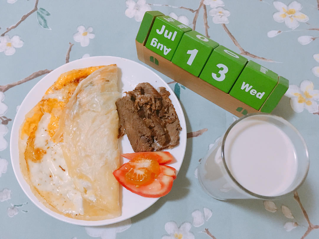 煎蛋🍳手抓饼加酱牛肉搭番茄🍅配核桃乳