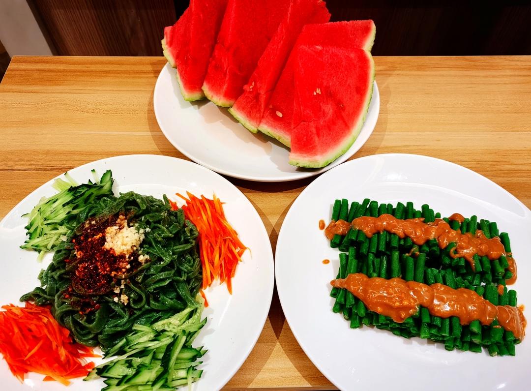 凉拌菠菜面,花生酱拌,豇豆角!