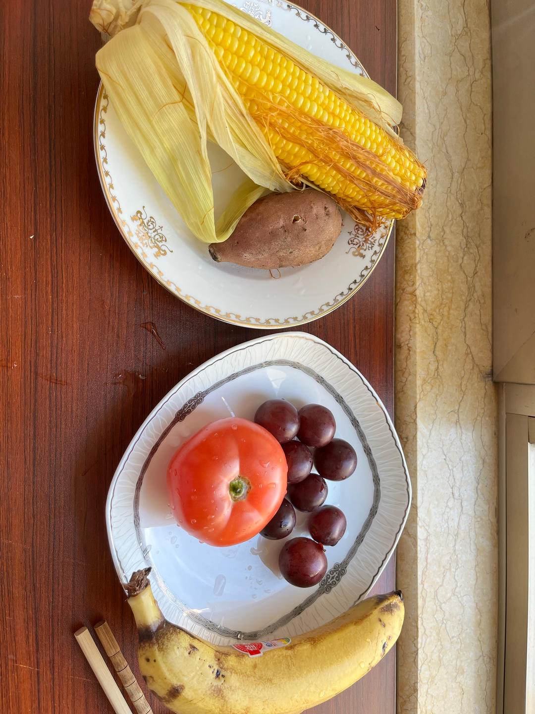 牛奶燕麦鸡蛋粥, 煮玉米,玫瑰花🌹馕,甜面酱蘸黄瓜,杏子。