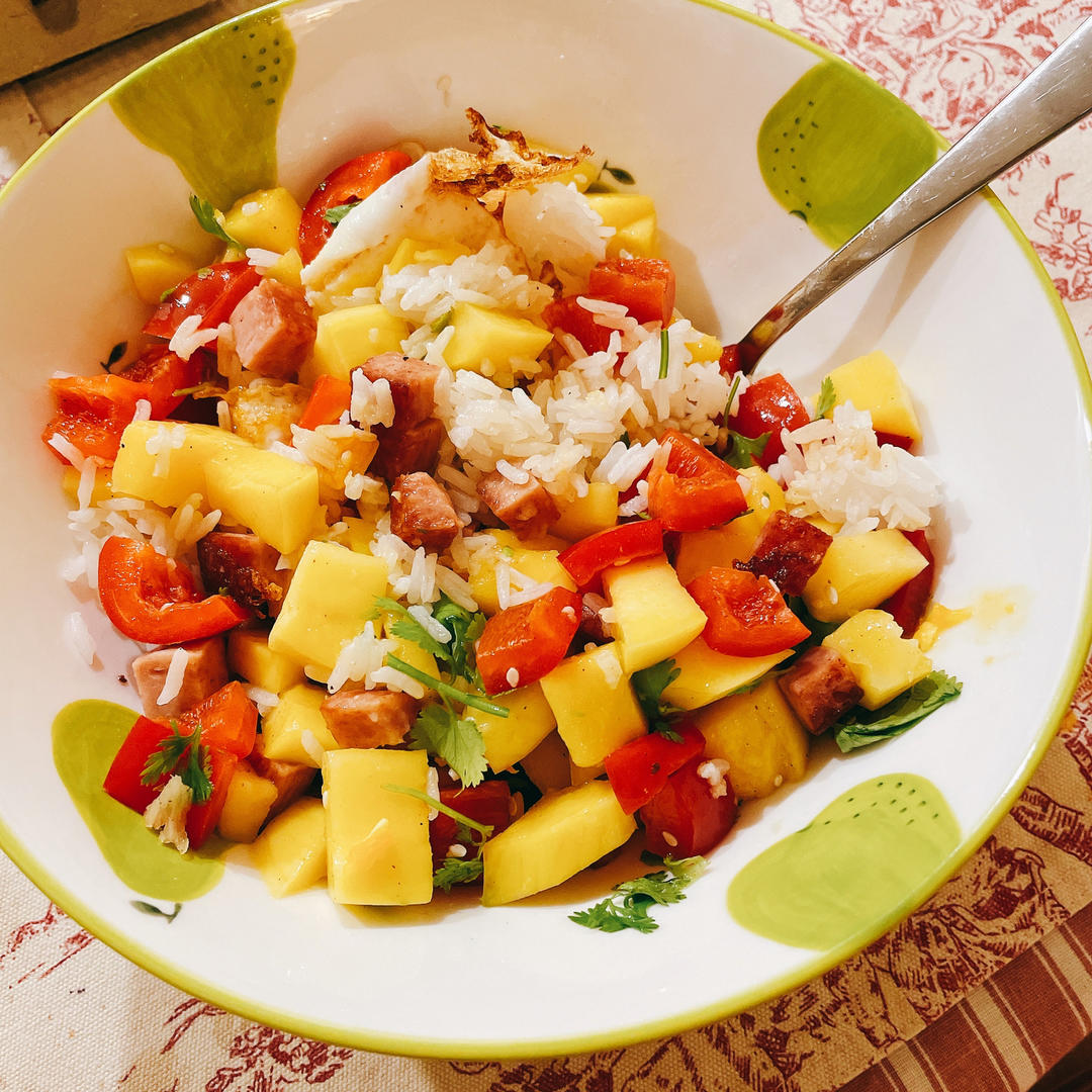 好久没有刷这一套,来一个芒果香肠拌饭!大晚上风雨中露天看戏,边看就边想着回来吃这个。