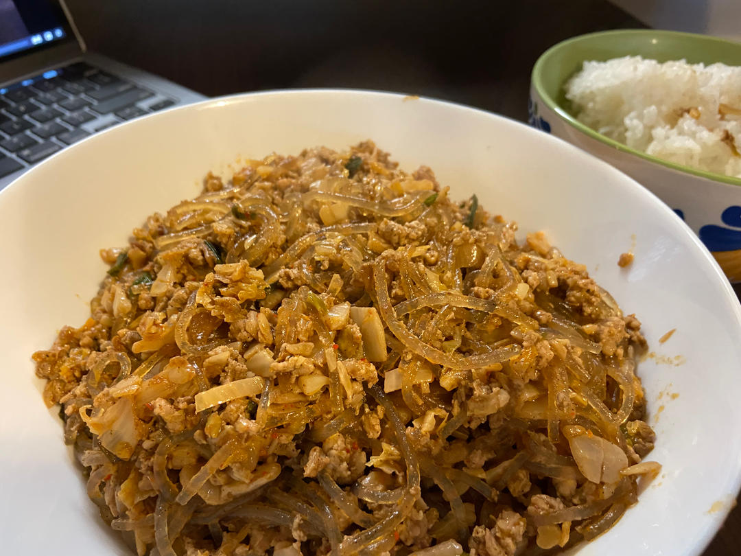 用酸菜猪肉馅饺子剩下的馅料做的蚂蚁上树,好吃😋