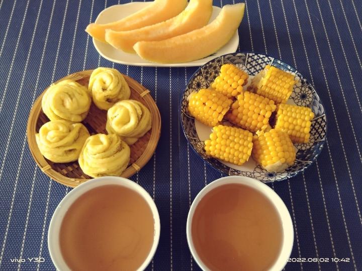 煮玉米,花卷,玉米水,甜瓜。