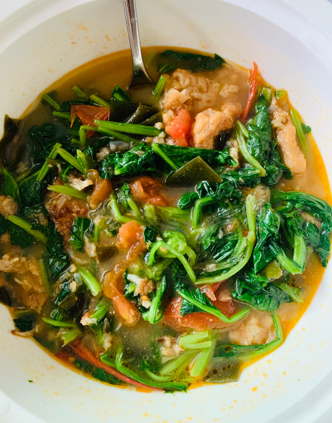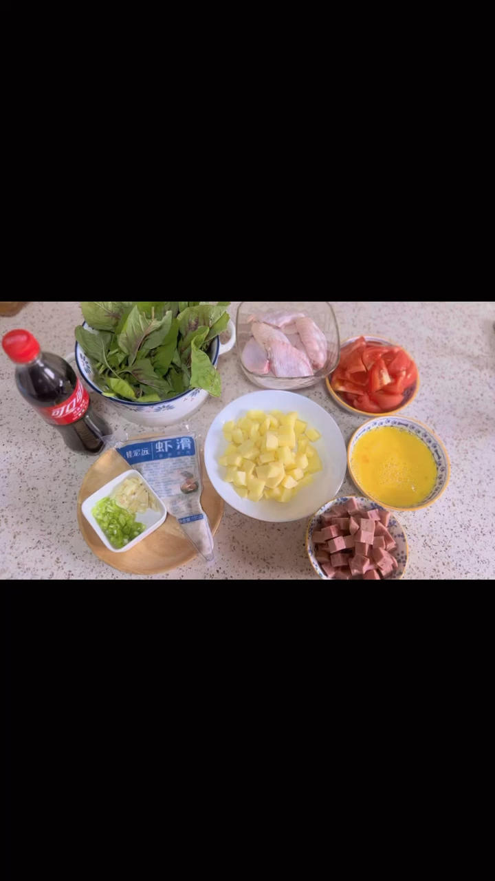 今日午餐:可乐鸡翅、番茄炒蛋、孜然土豆丁、苋菜虾滑汤。