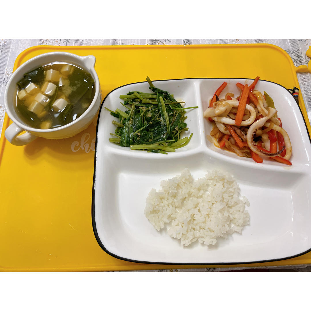 午餐 蒜蓉空心菜 甜椒炒鱿鱼 味增汤