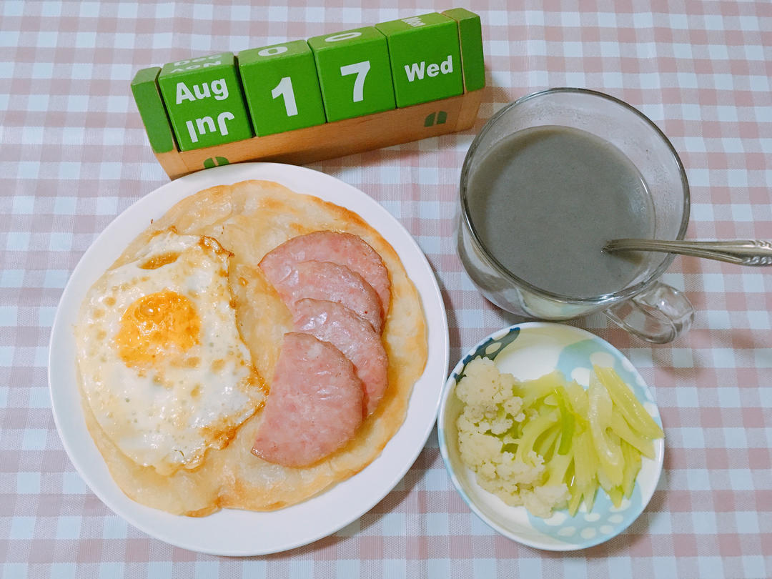煎蛋🍳手抓饼加罗汉肚搭芹菜及菜花配黑芝麻糊