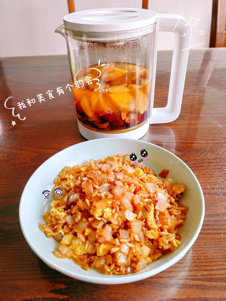 给麦兜小朋友做的蛋炒饭,家里没有胡萝卜了,多放了一些葱头,另外煮了助消化的苹果山楂红枣茶