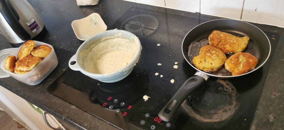 没有泡打粉,也没有和面,浓稠一点的面汤直接倒进油里高温炸的,倒的面形状比较随意