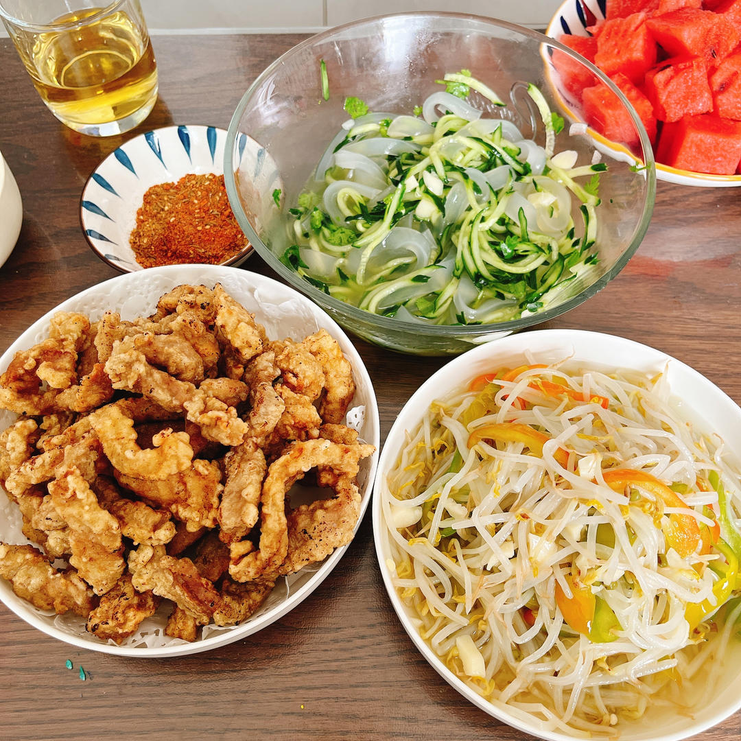 小酥肉🥩➕绿豆芽🫒➕拌拉皮🥗➕西瓜🍉🟰饱餐一顿🐣
