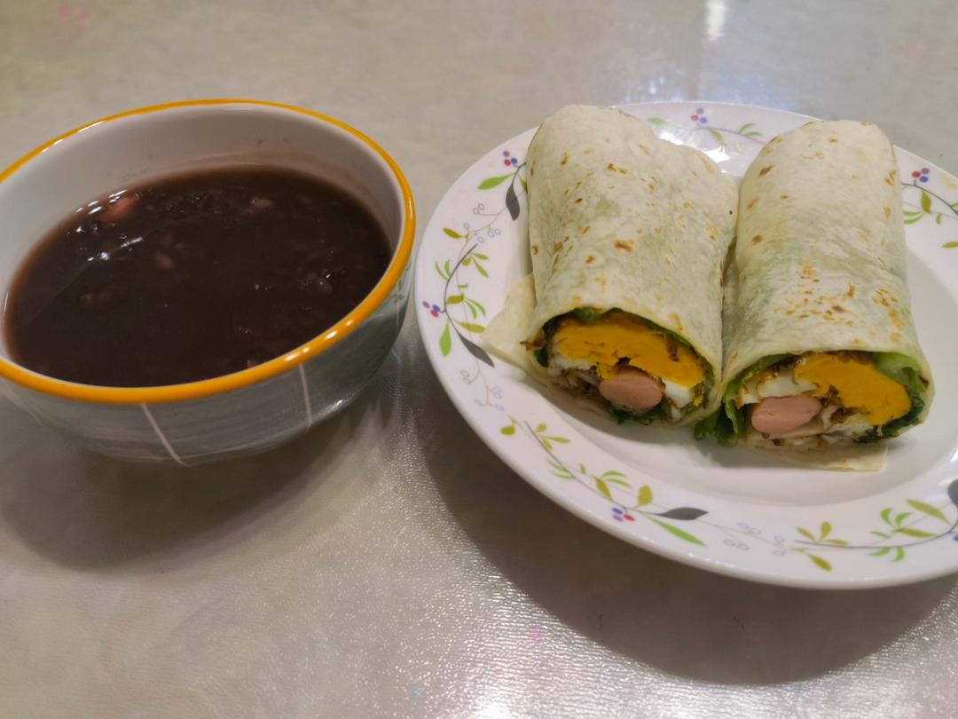 紫薯黑米粥+卷饼(煎蛋火腿肠生菜沙拉酱)
