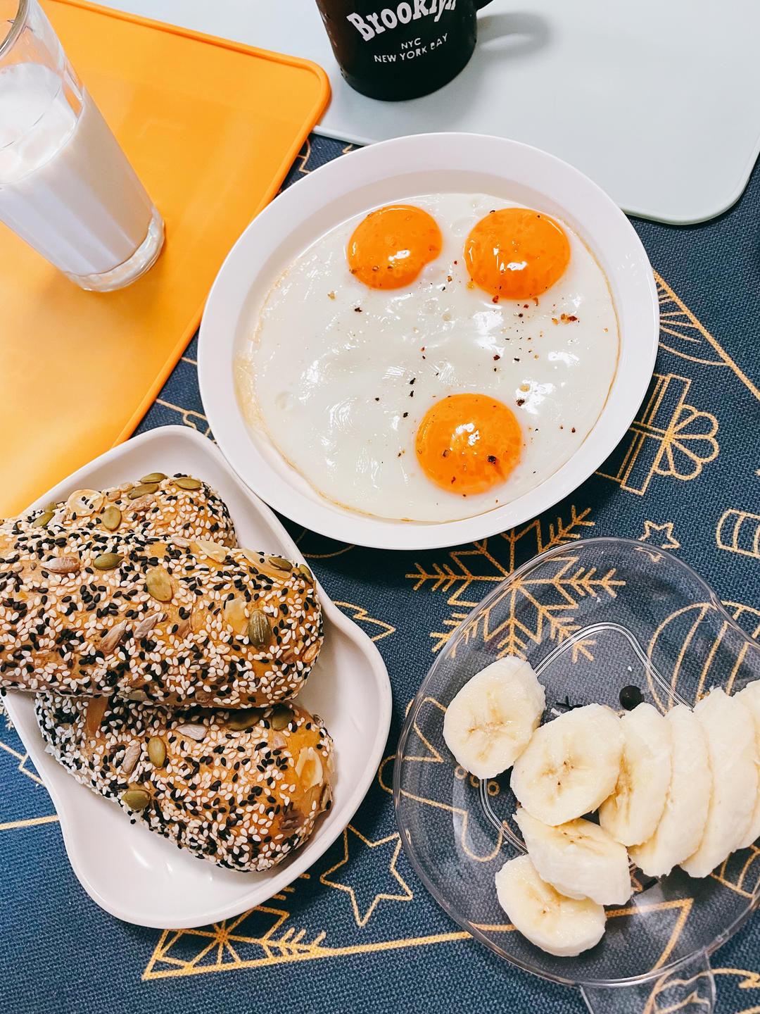 起晚了,还好有昨天美邻分享的奶酪杂粮包,煎个蛋切根香蕉上桌