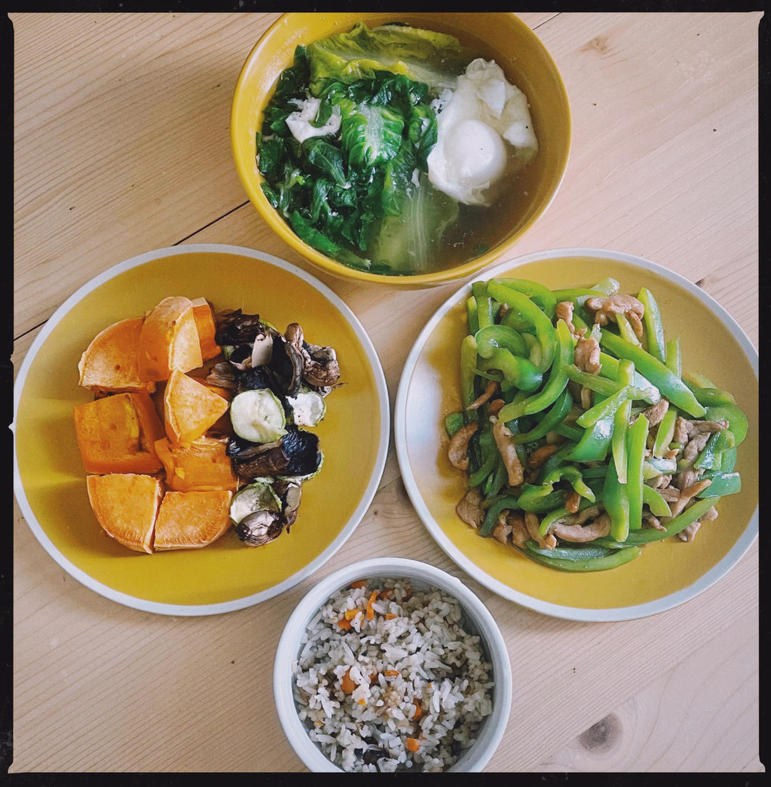 小青菜荷包蛋汤+青椒肉丝+烤蔬菜