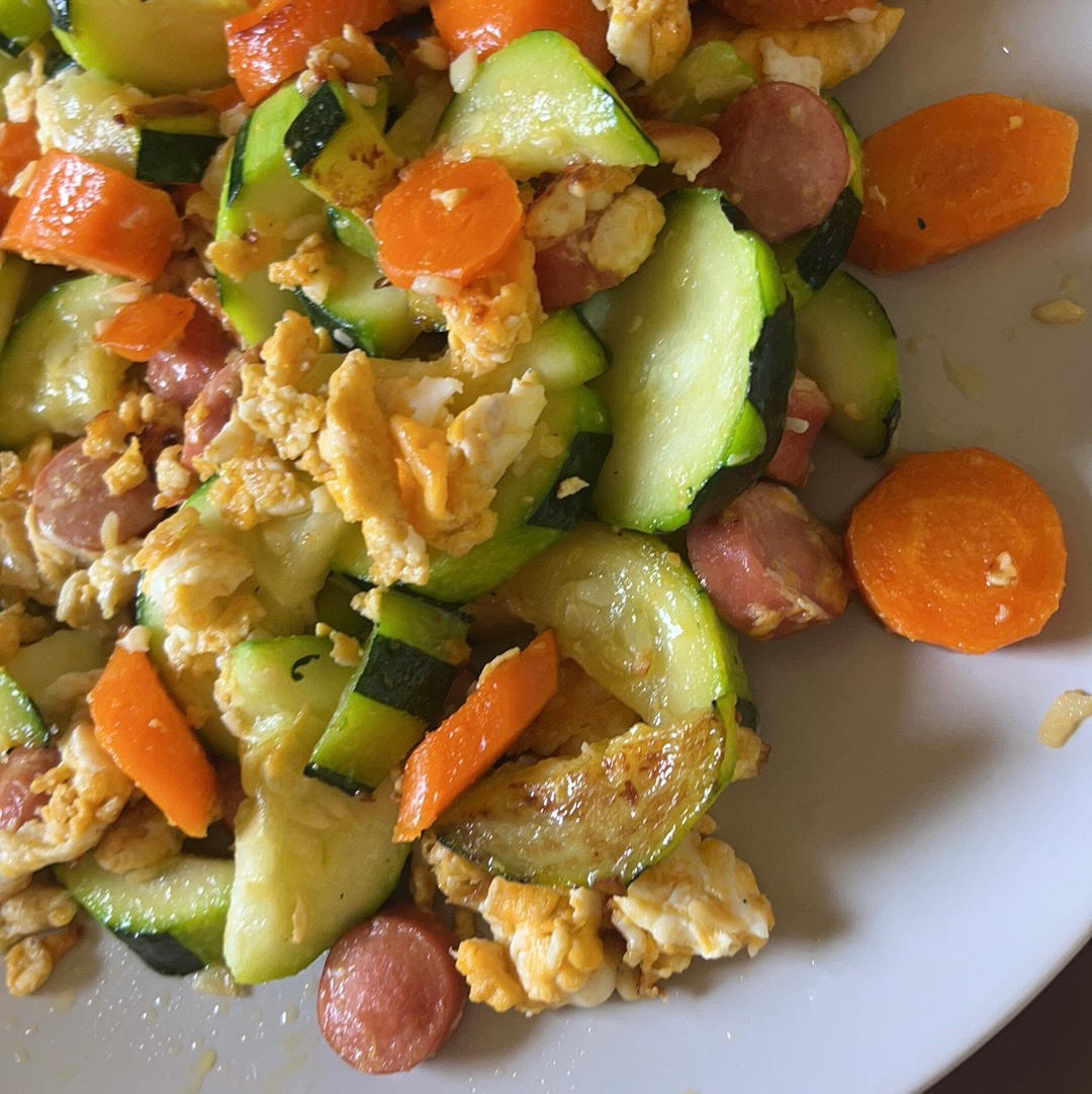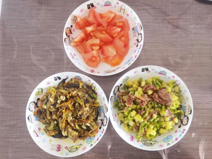 2022年9月23日(静默管理第34天)午餐:腊肠炒蒜苔+蒜香茄条+糖拌柿子