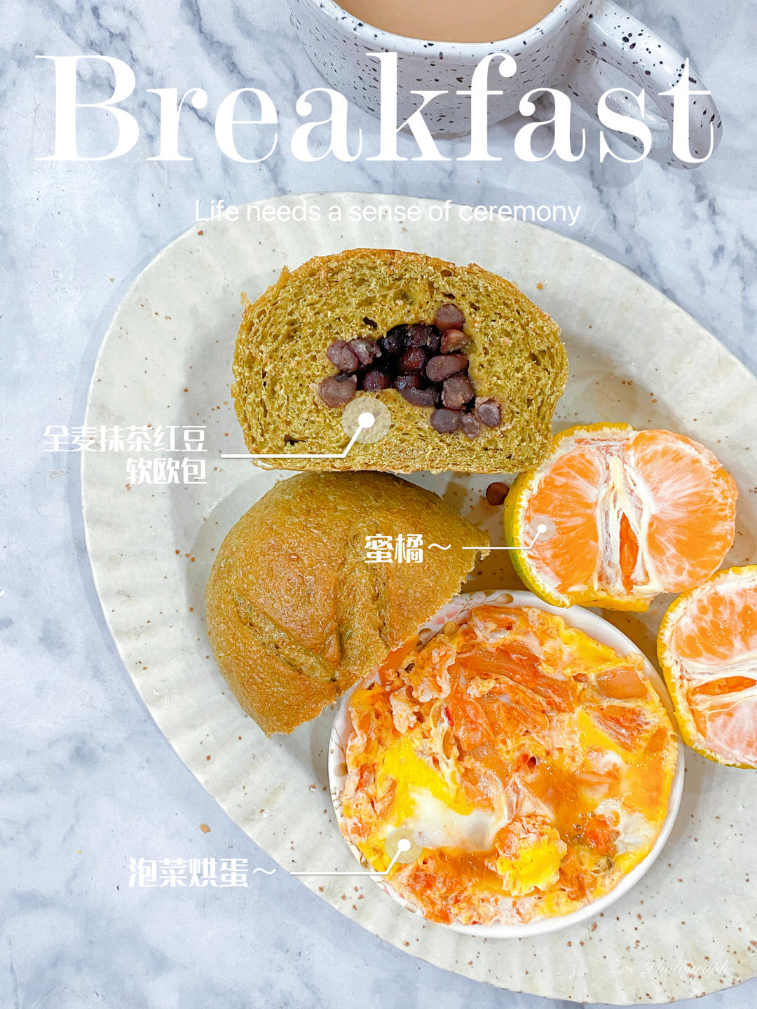 早:☕奶咖+🥯全麦抹茶红豆欧包+🍊+🍳