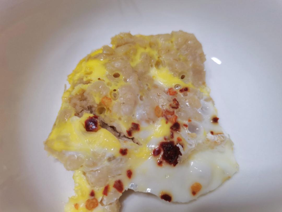 燕麦面粉三比一,加了柚子茶,鸡蛋放在上层,加油和辣椒粉。带着柚子味儿的甜辣,还蛮好吃。