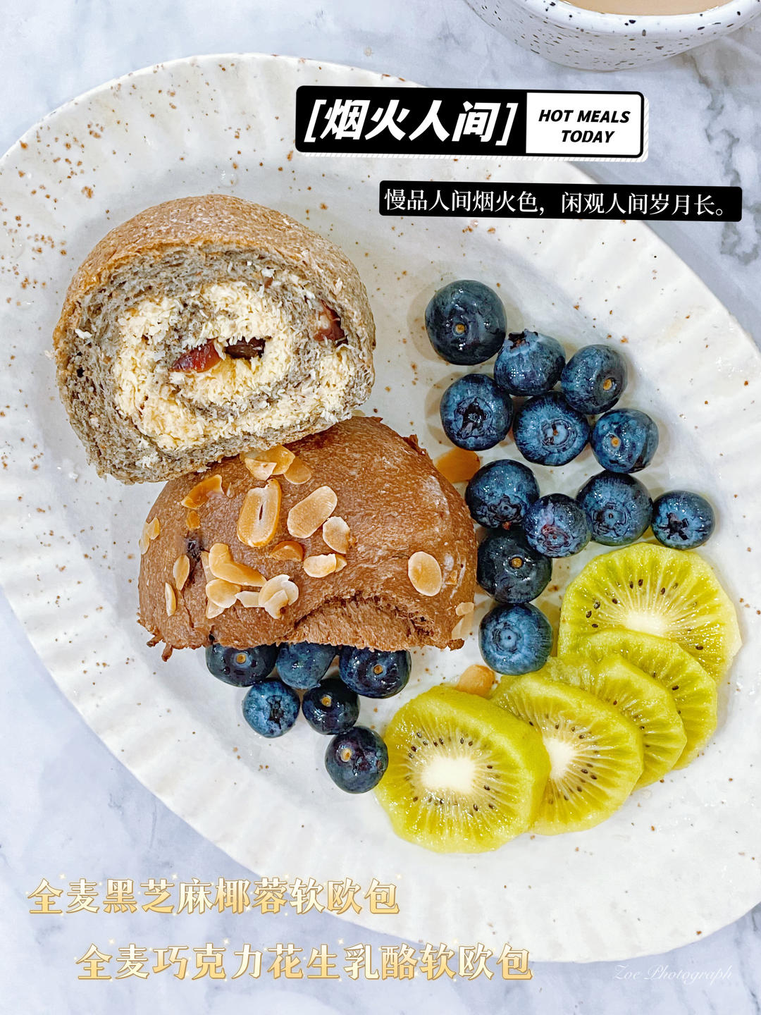 早:☕奶咖+🥯全麦黑芝麻椰蓉&全麦巧克力花生乳酪软欧包