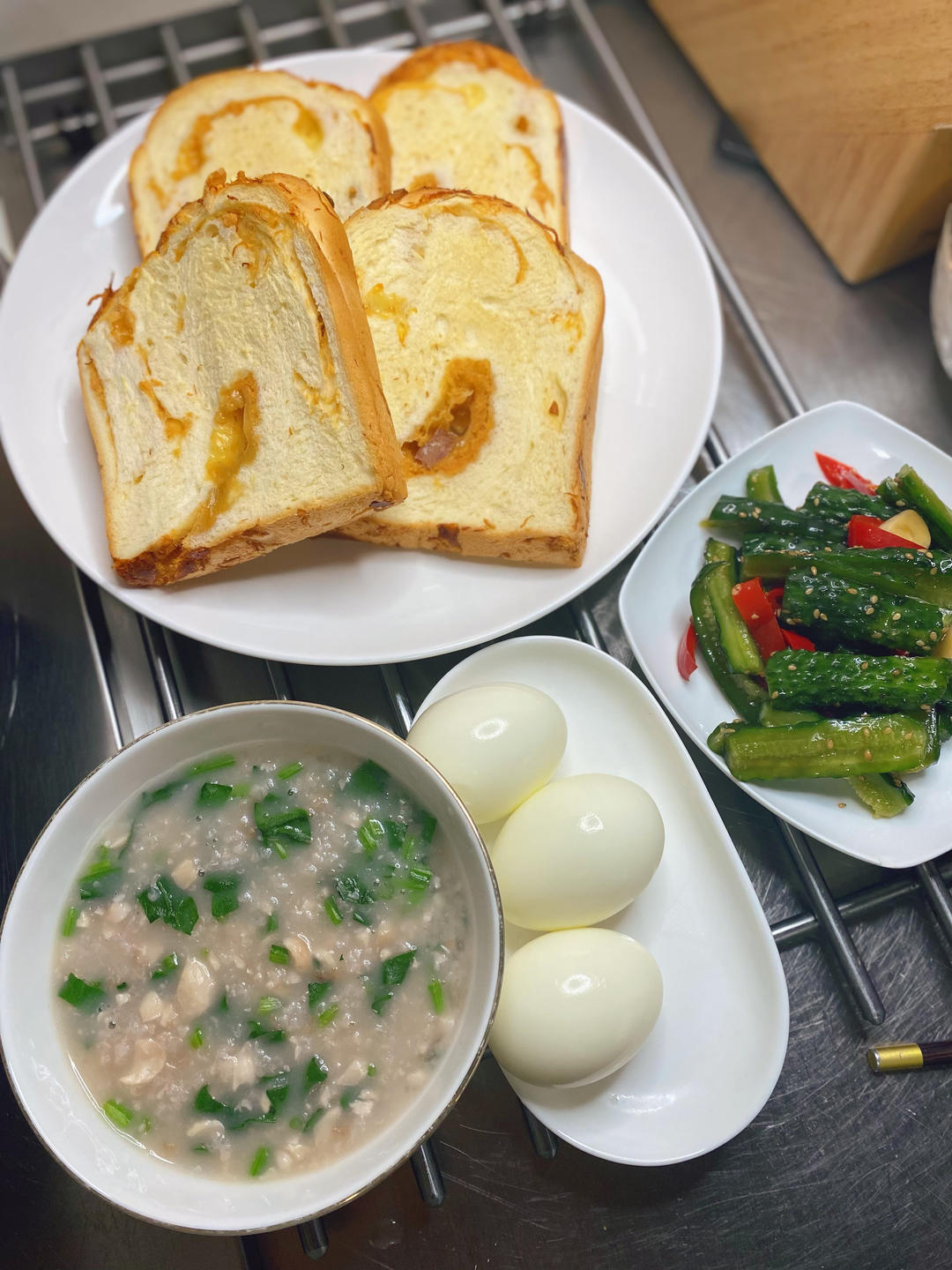 花生蔬菜粥,面包,鸡蛋,黄瓜🥒